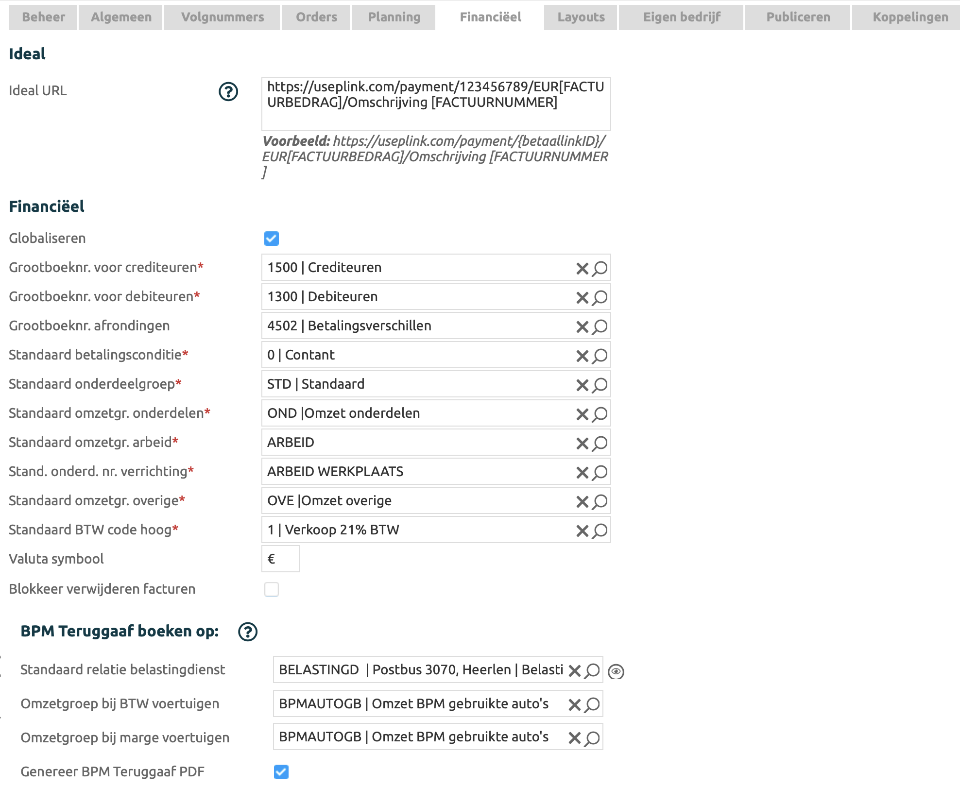 Instellingen die te maken hebben met de financiën binnen Autoflex