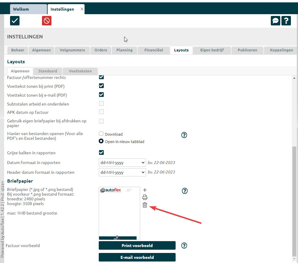 3. Scrol naar beneden en klik op het prullenbakje naast het briefpapier |