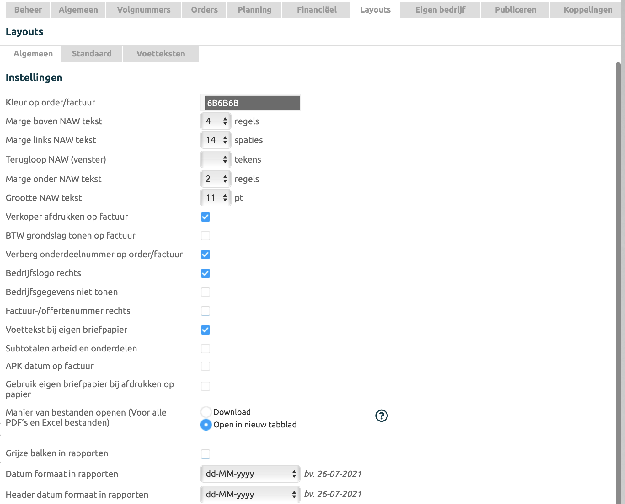 Instellingen voor de layouts binnen Autoflex, dit zijn de layouts voor de facturen en andere PDF’s die Autoflex aanmaakt.