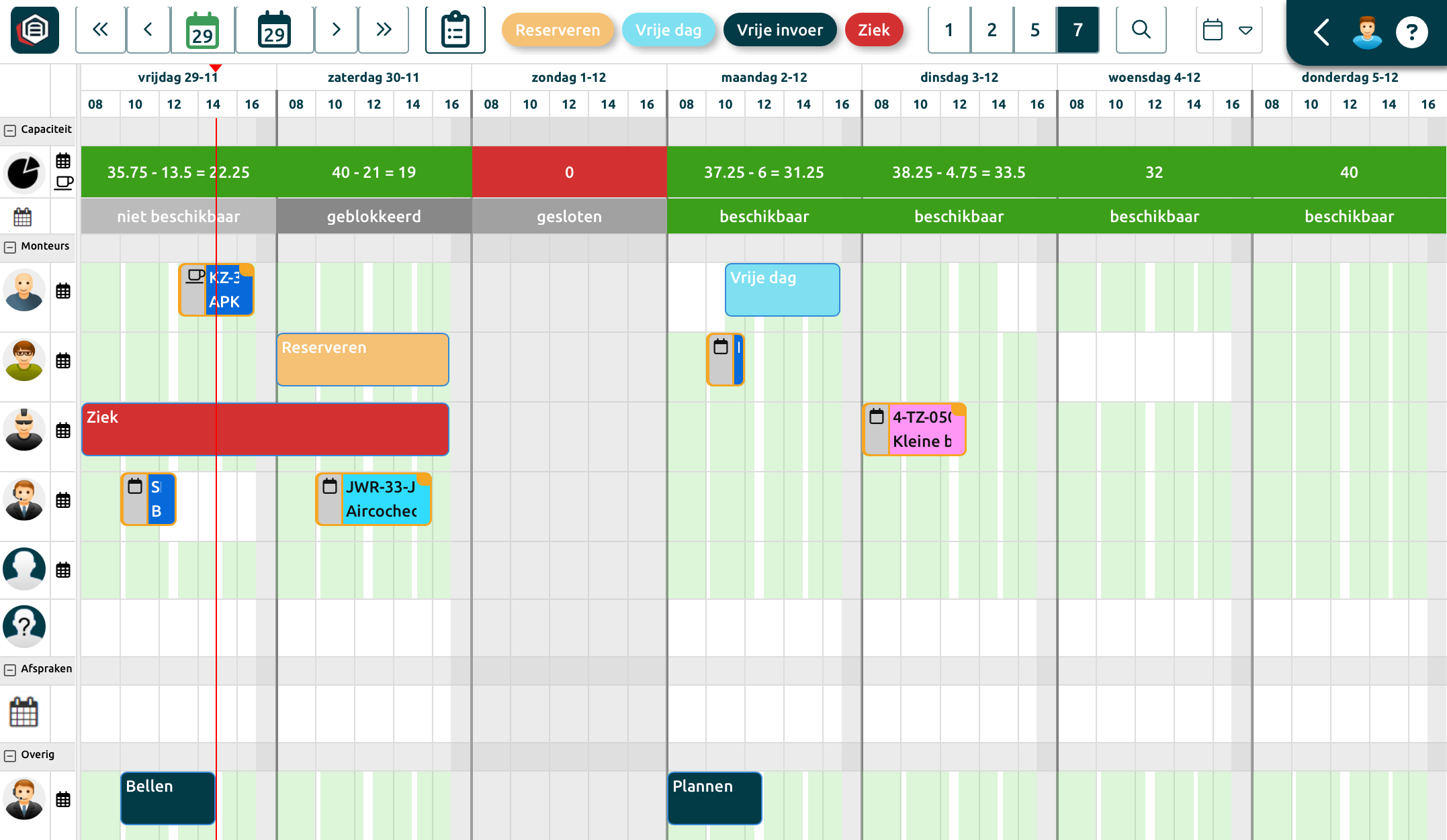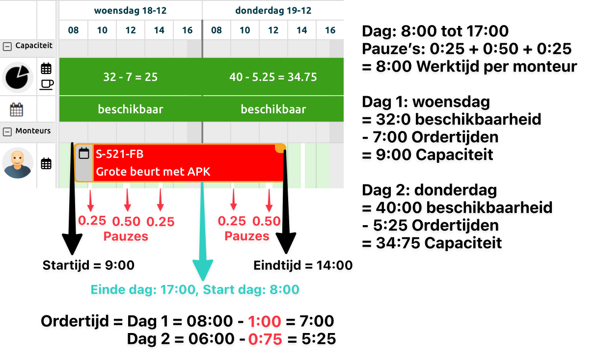 Capaciteit is de beschikbaarheid in de werkplaats van de uren die nog beschikbaar zijn. De uren worden alleen berekend over uren die de monteurs maken (personeel → Functie → Monteur)