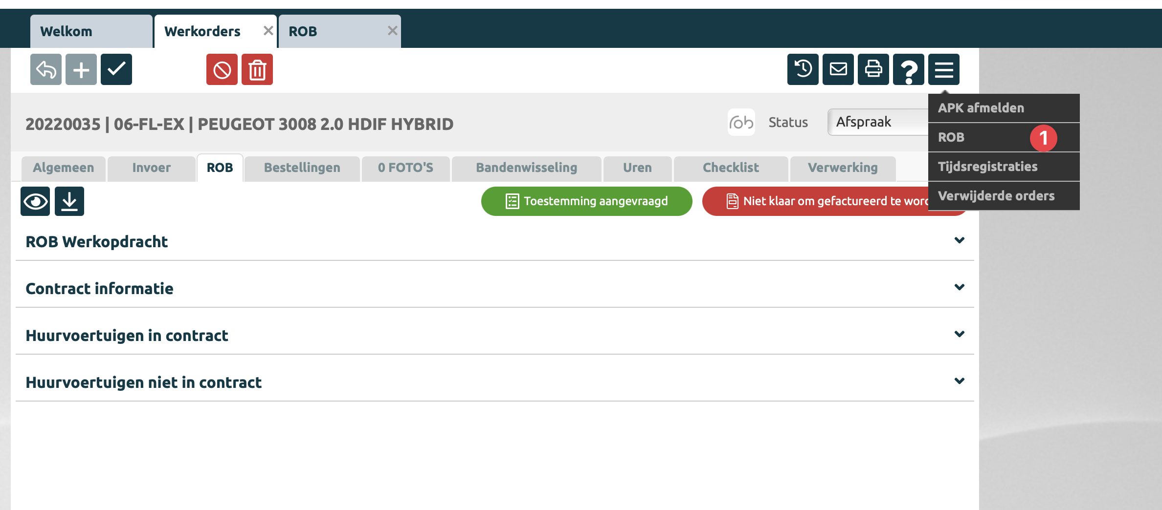 Kies in de werkorder, hamburger menu → ROB, om het ROB overzicht te openen |