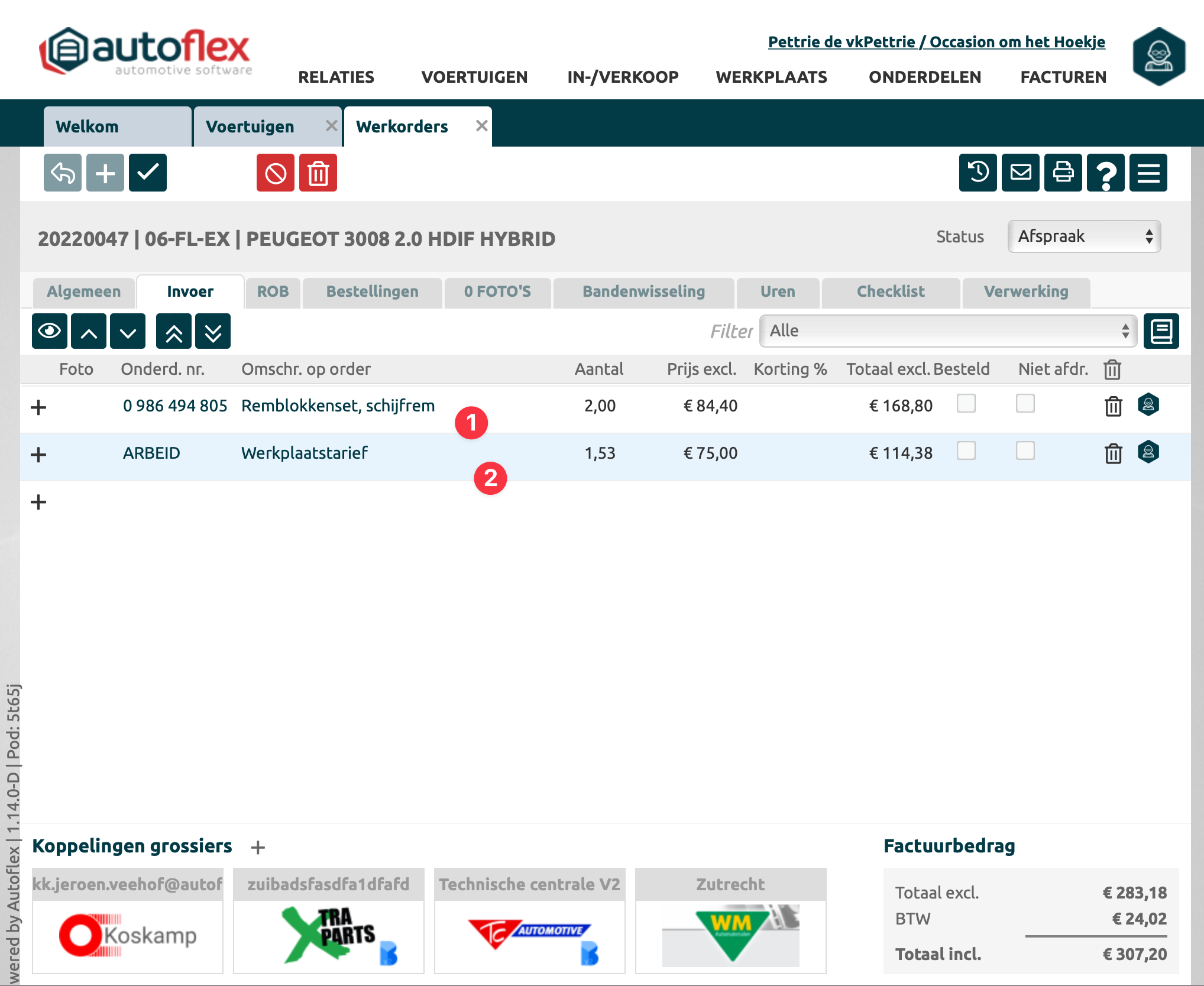 Op de tab: Invoer, voeg onderdelen en arbeid toe aan de order |