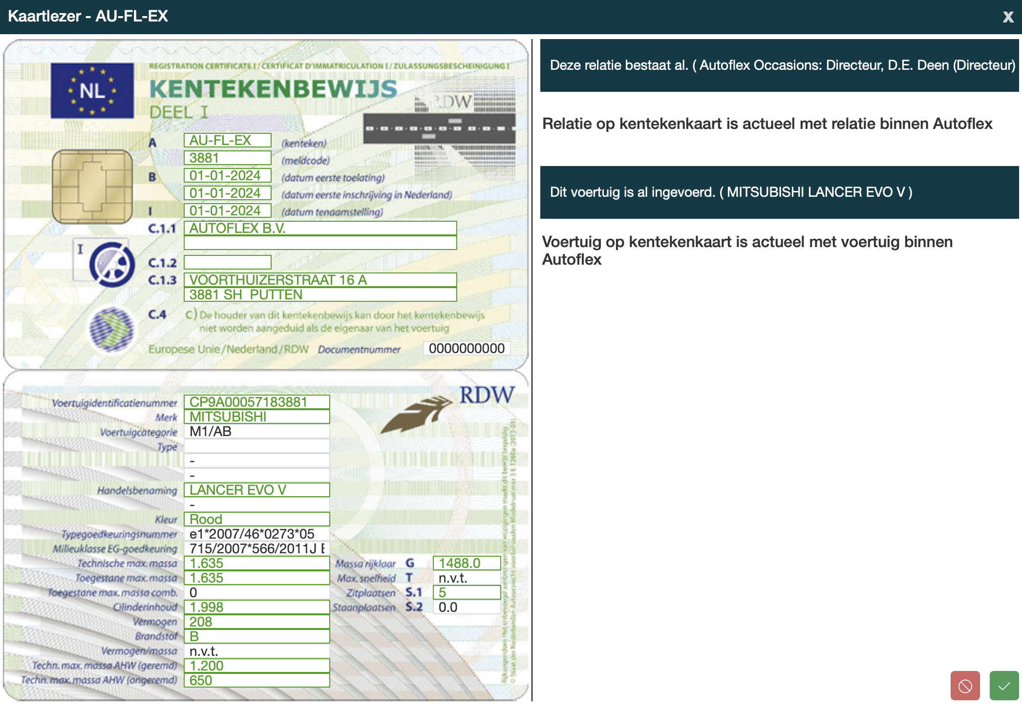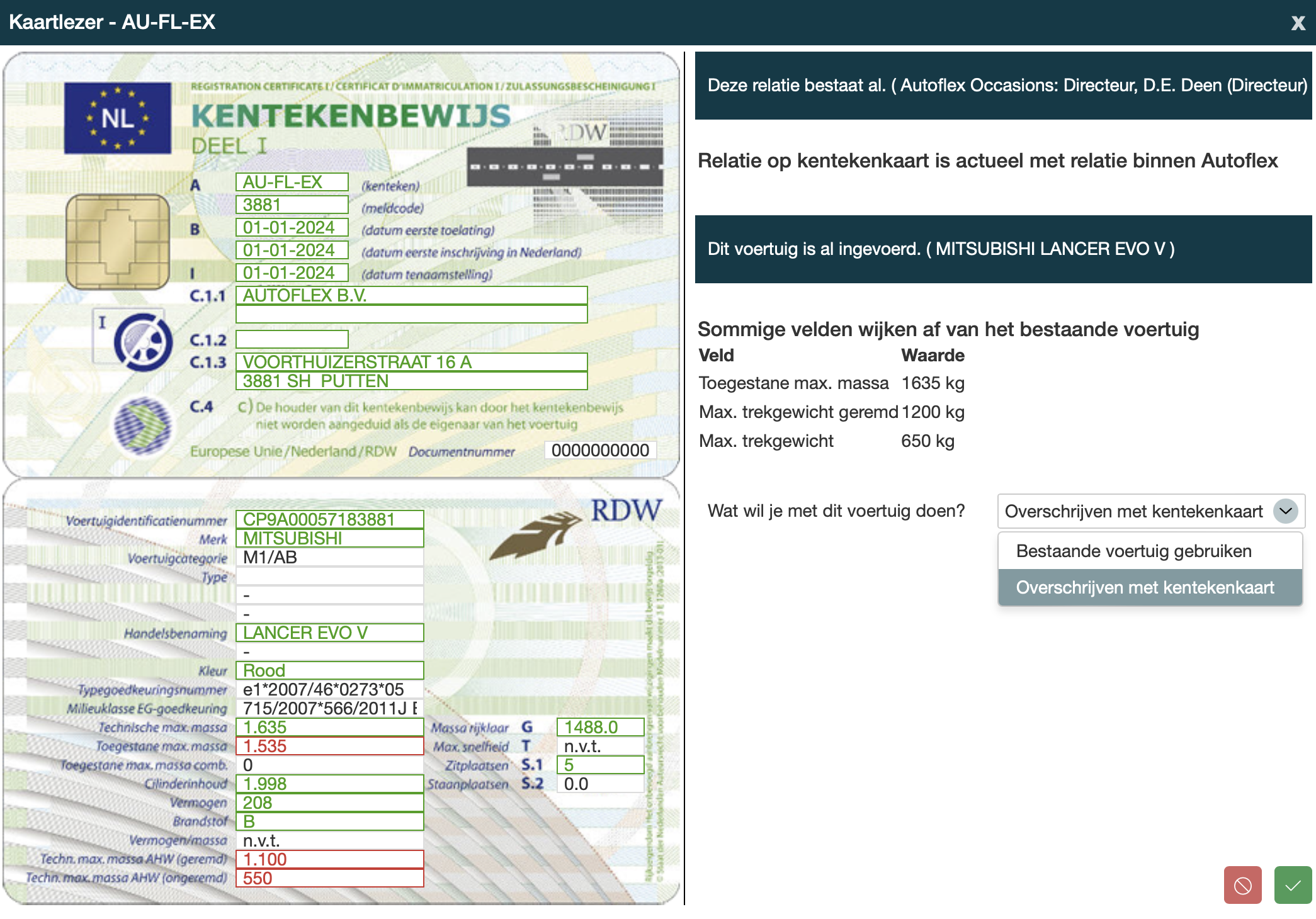 De relatie kan worden geupdate met de gegevens van het kentekenbewijs, zie de in rood aangegeven velden. |