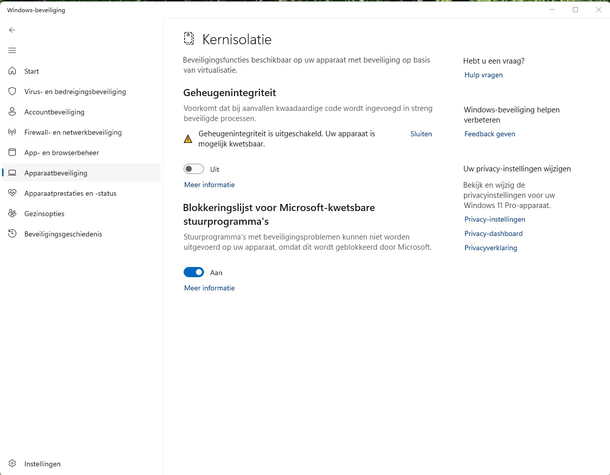 3. Installeer de CardReader driver Indien de windows beveiliging op hoog is ingesteld wordt de installatie van de driver niet automatisch uitgevoerd, je moet dan de kernisolatie in Apparaatbeveiling eerst uitschakelen. Het werkstation even opnieuw opstarten, de cardreader opnieuw aansluiten en dan wordt het stuurprogramma wel geïnstalleerd. Daarna kan je de beveiliging weer aan zetten en het werkstation opnieuw opstarten. Ga naar Start: type Apparaatbeveiliging. Zet hierin d kernisolatie uit. |