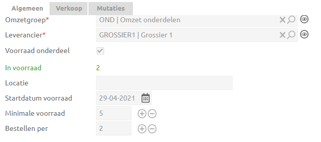 In het detail van het onderdeel zie je de actuele voorraad van het onderdeel. Door de velden "Minimale voorraad" en "Bestellen per" in te vullen, zal er voor dit onderdeel ook een besteladvies worden gegenereerd. Op het tabblad mutaties zie je waar en wanneer het onderdeel gemuteerd is.  |