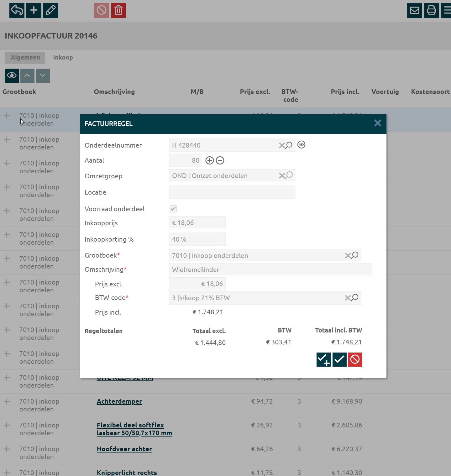 Inkoopfacturen van je grossier voer je in via onderdelen → inkoopfacturen. Het aantal dat je invoert, verhoogt de voorraad van het onderdeel.  |