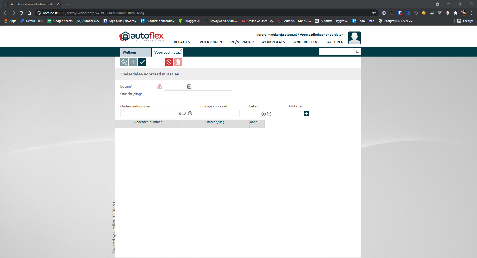 Het starten van de voorraad doe je door de voorraadmutaties in te voeren. Je vindt dit scherm via onderdelen → voorraad mutaties. Hier wordt de start van de voorraad van de onderdelen aangemaakt en voer je de periodieke tellingen van de voorraad door.  |