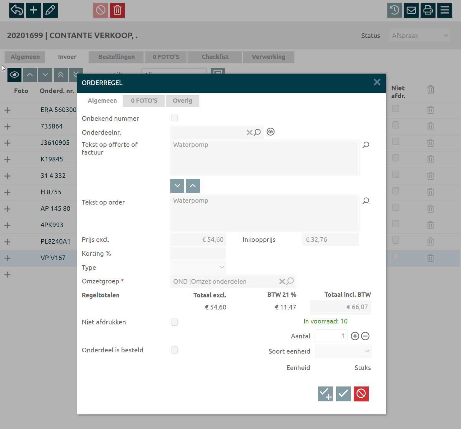 Een onderdeel verkopen doe je via een werkplaats- of autoverkoop-order. Tijdens het kiezen van het onderdeel zie je de actuele status. De voorraad wordt verlaagd met het aantal dat je invoert als de status van de order "Order" of "Gereed" is.  |