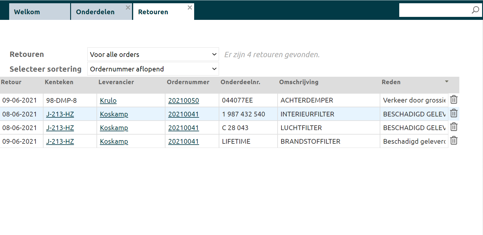 Het overzicht van de retouren, in het overzicht kan gefilterd en gezocht worden om de juiste retour te vinden. Met het icoon: prullenbak, kan de retour verwijderd worden uit het overzicht. |