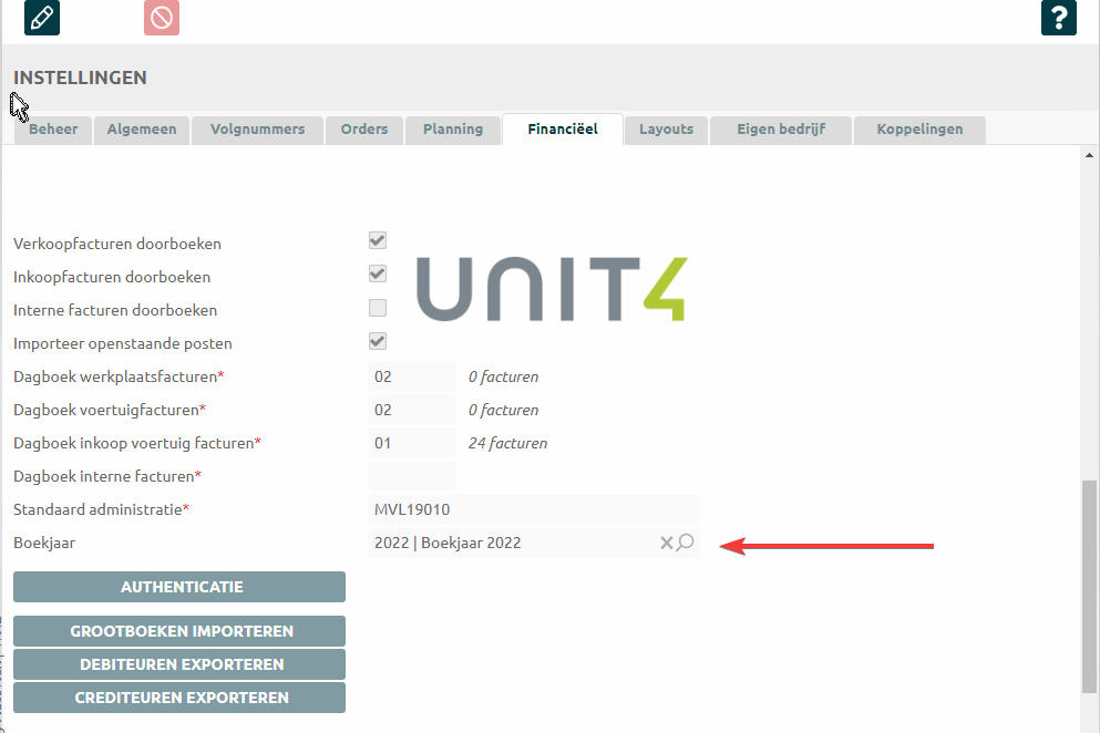 Voor de gebruikers met een koppeling naar het online boekhoudpakket van Unit4, moet er in autoflex ook een nieuw boekjaar aangemaakt worden. Dit is nodig om de openstaande posten goed te kunnen importeren.