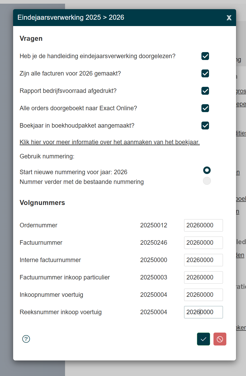 bijvoorbeeld 20251348, wordt nu 20260000, zodat het eerstvolgende factuurnummer 20260001 wordt.Klik als laatste op het vinkje om de wijzigingen op te slaan.