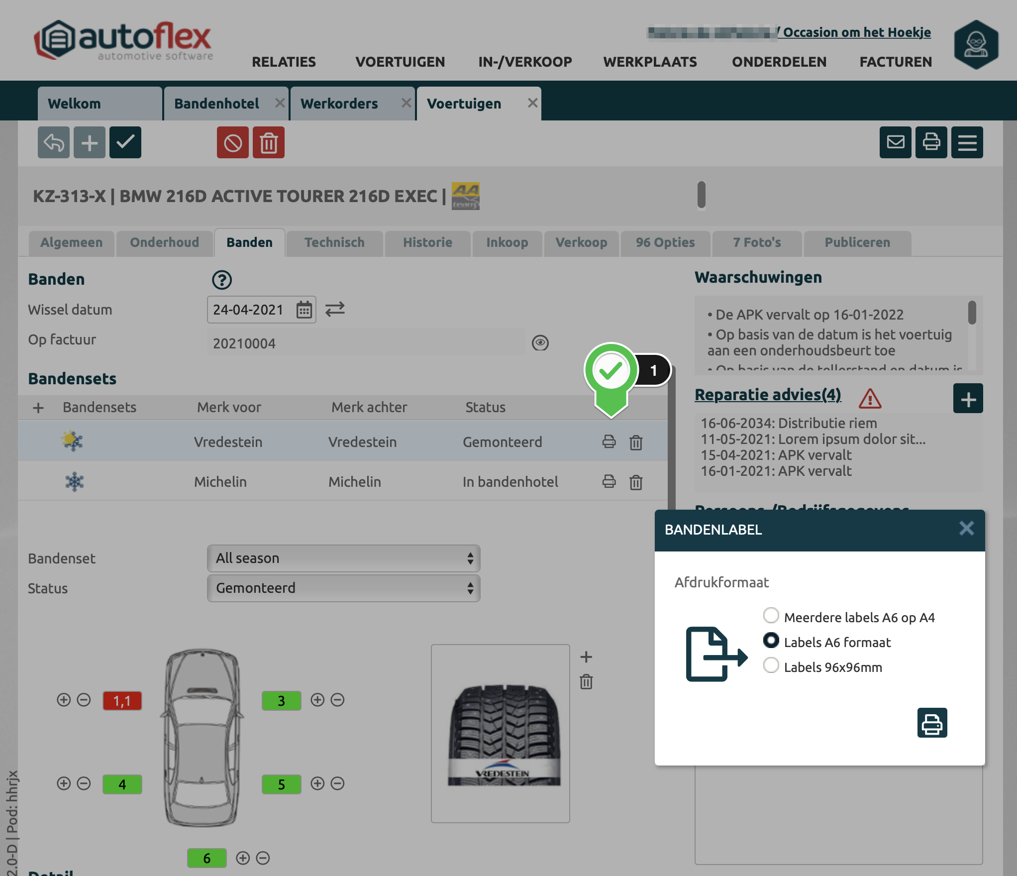 Vanuit het voertuig is het mogelijk om van de in het overzicht geselecteerde bandenset labels te printen.