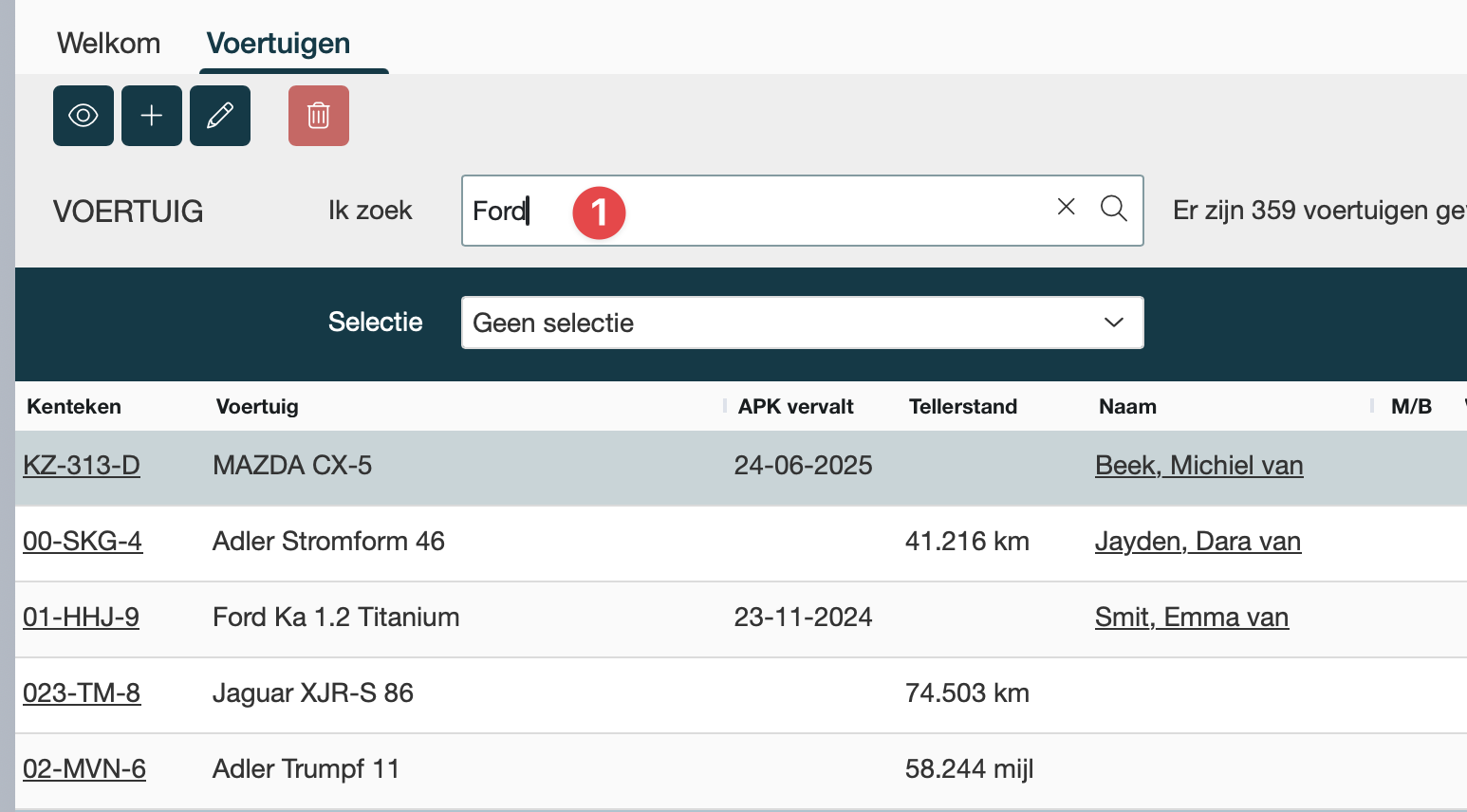 De voertuigenlijst toont een overzicht van alle voertuigen in het systeem. Bovenaan deze lijst kun je zoeken via de algemene zoekbalk of de specifieke zoekbalk voor kentekens.