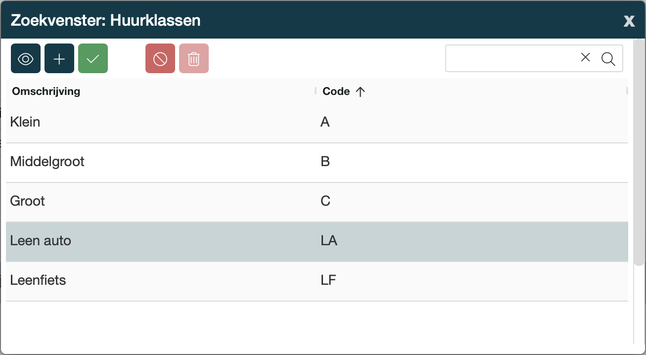 Selecteer nu een huurklasse door op het vergrootglas te klikken |