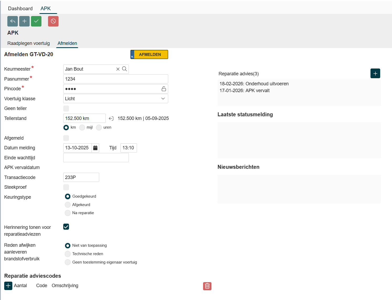 Kies het keuringstype (goedgekeurd, na reparatie of afgekeurd) |