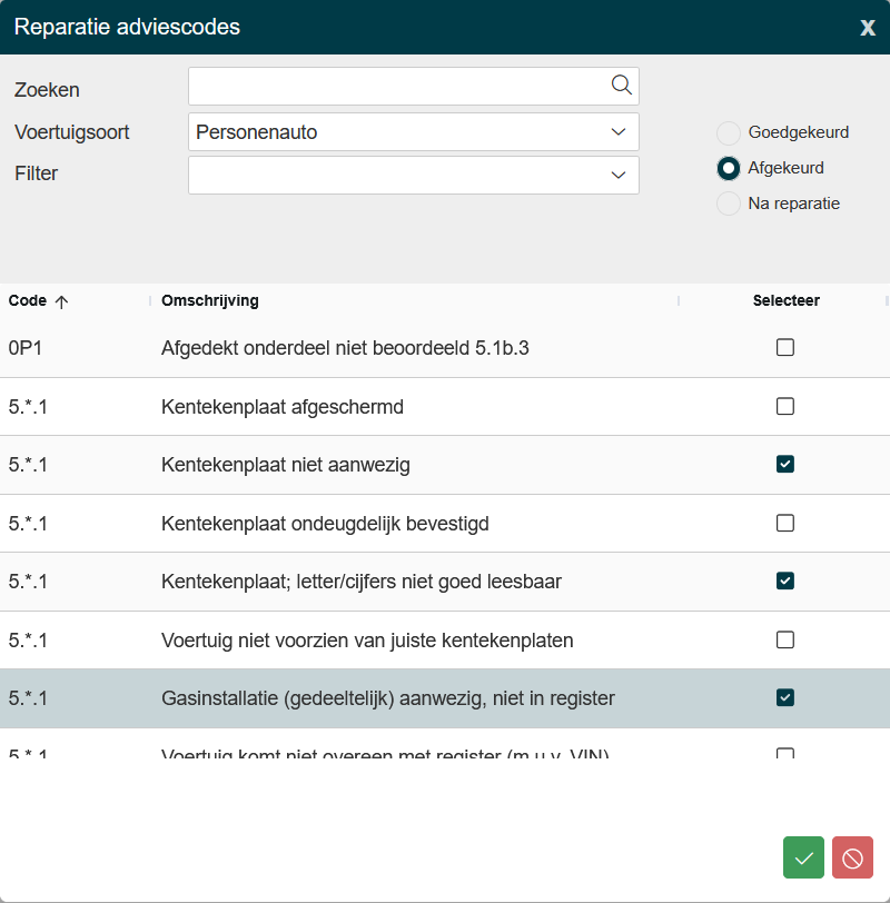 Heeft het voertuig afkeur- of reparatiepunten, ben je verplicht deze aan te geven aan de hand van de coderingslijst reparatie- of afkeurpunten. Zet een vink aan bij alle punten die van toepassing zijn en klik op opslaan om terug te keren naar het afmeldscherm. |