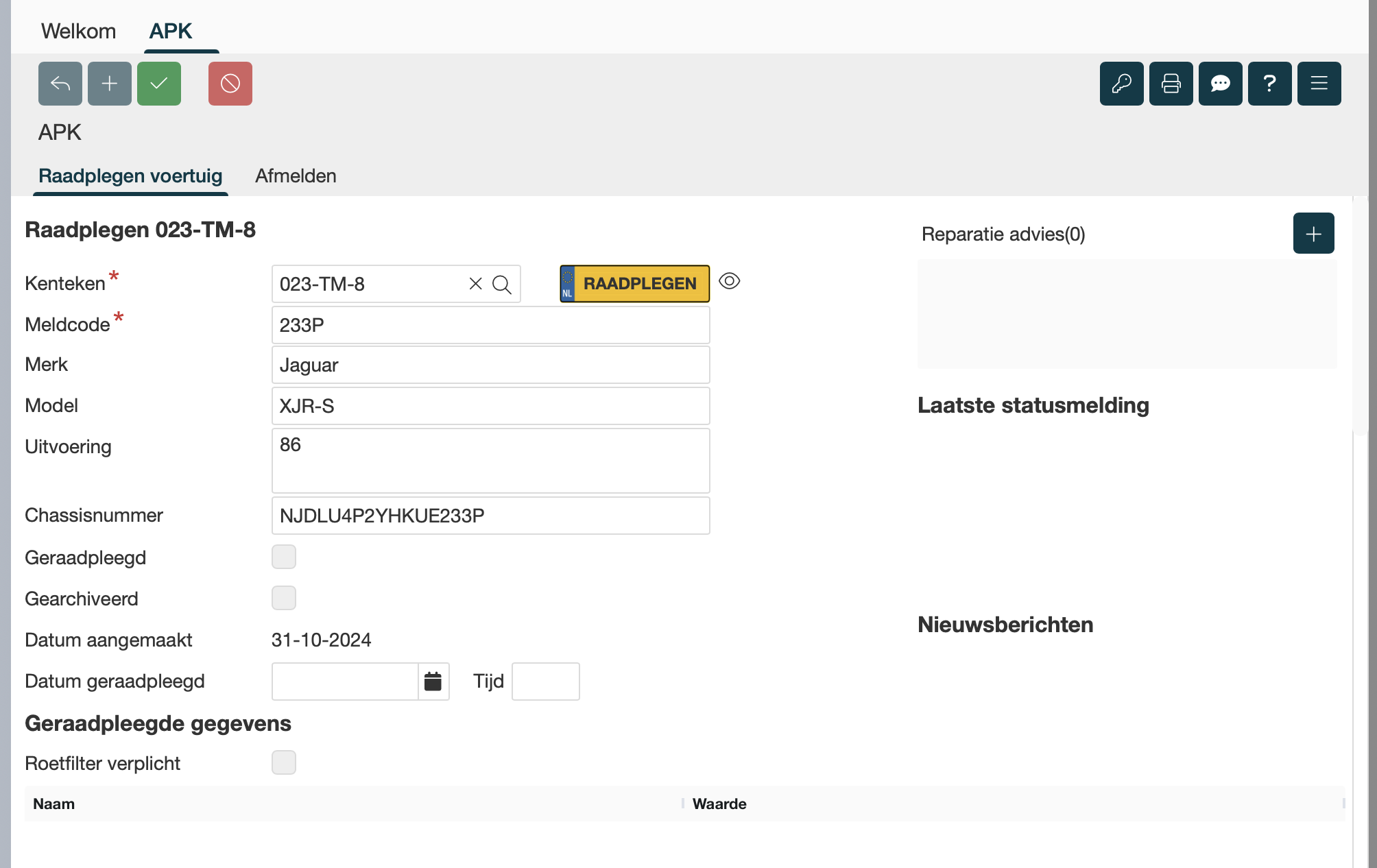 Je begint met het kenteken en de meldcode van het voertuig, om het vervolgens te Raadplegen. De geraadpleegde gegevens worden in het tabblad ingevuld. Controleer deze gegevens goed! |