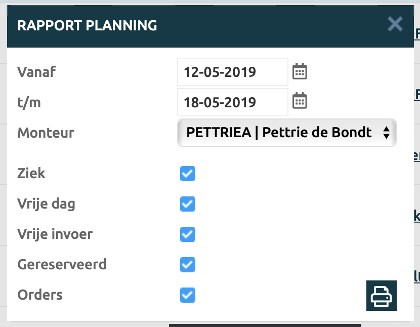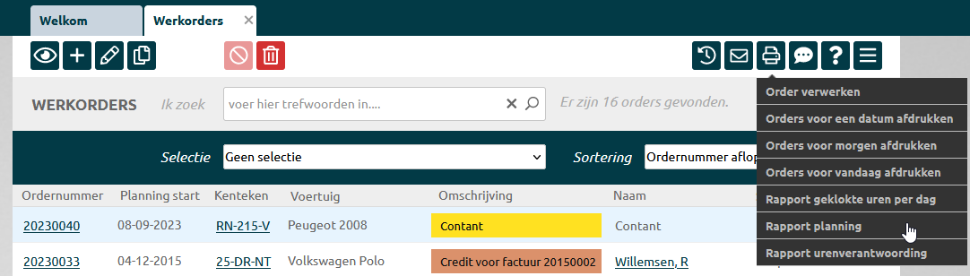 - Werkplaats → Werkorders → printer icoon rechts boven in → Rapport Planning