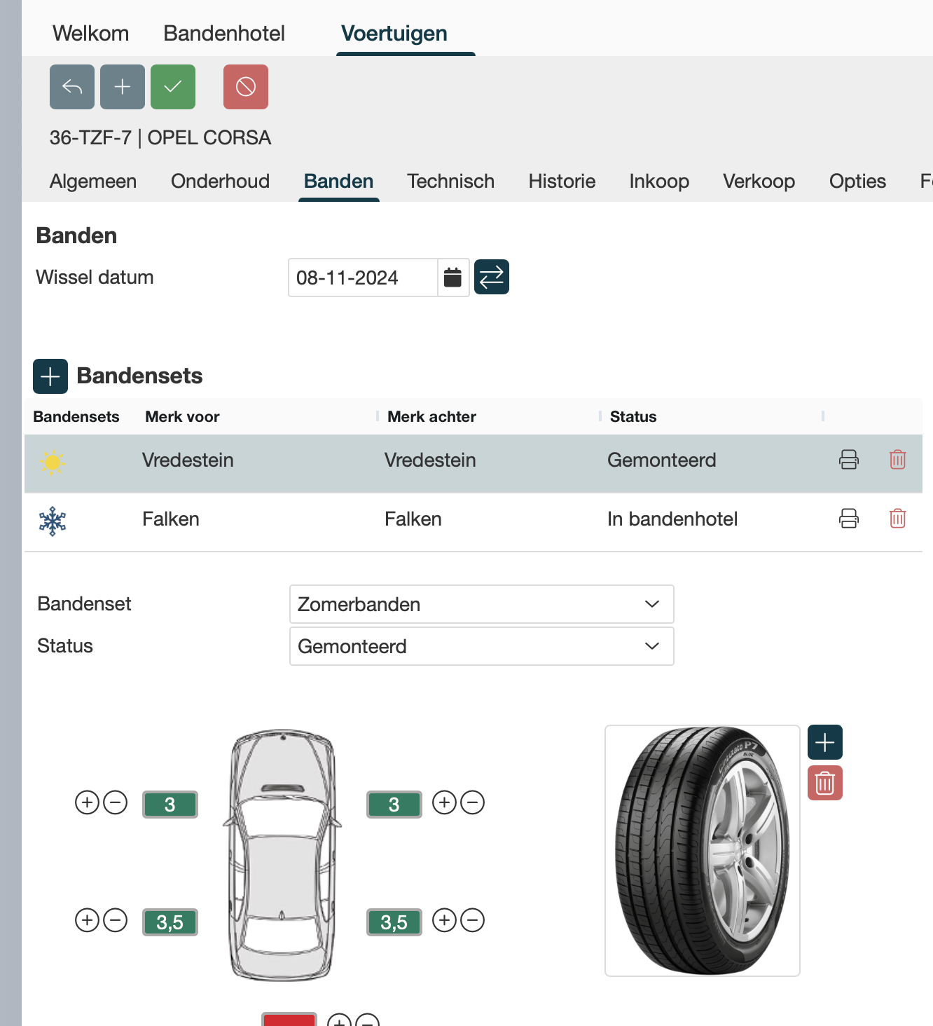 Status: Per bandensetset kan je aangeven of ze gemonteerd zijn, bij de klant liggen of in de bandenhotel.