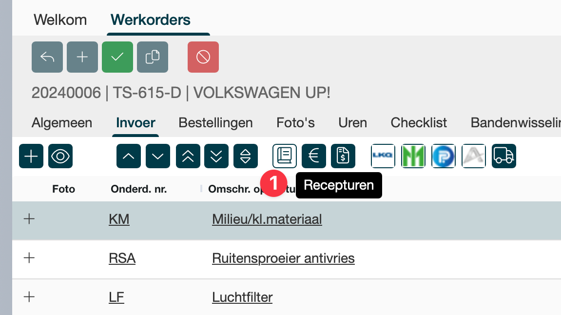 Klik op het icoon wat hieronder in het scherm een rood vierkant heeft, daarin staan recepturen die je kan gebruiken voor in je werkorder. | |