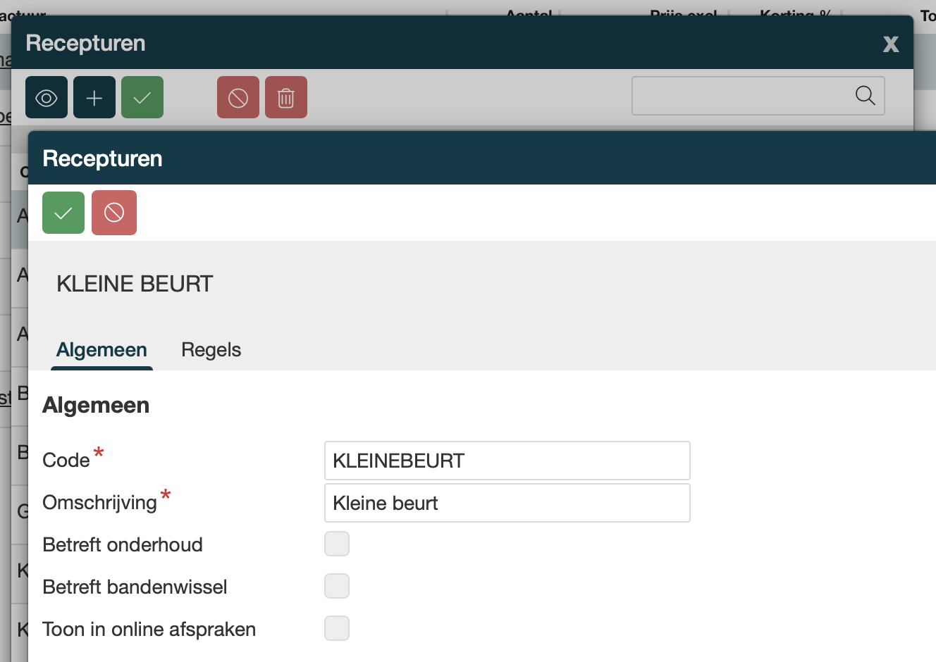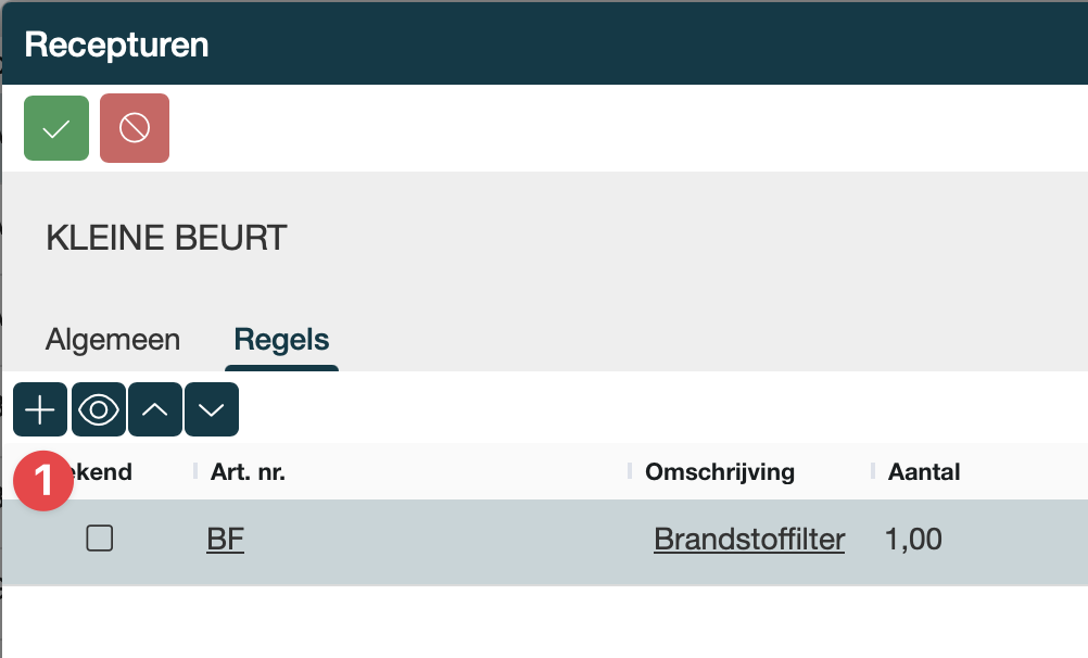 Vul daarna het tabblad Regels in. Met het plusje maak je orderregels aan, als de receptuur klaar is, klik je op vinkje om op te slaan. De aangemaakte receptuur kan je meteen gebruiken voor je werkorder, |