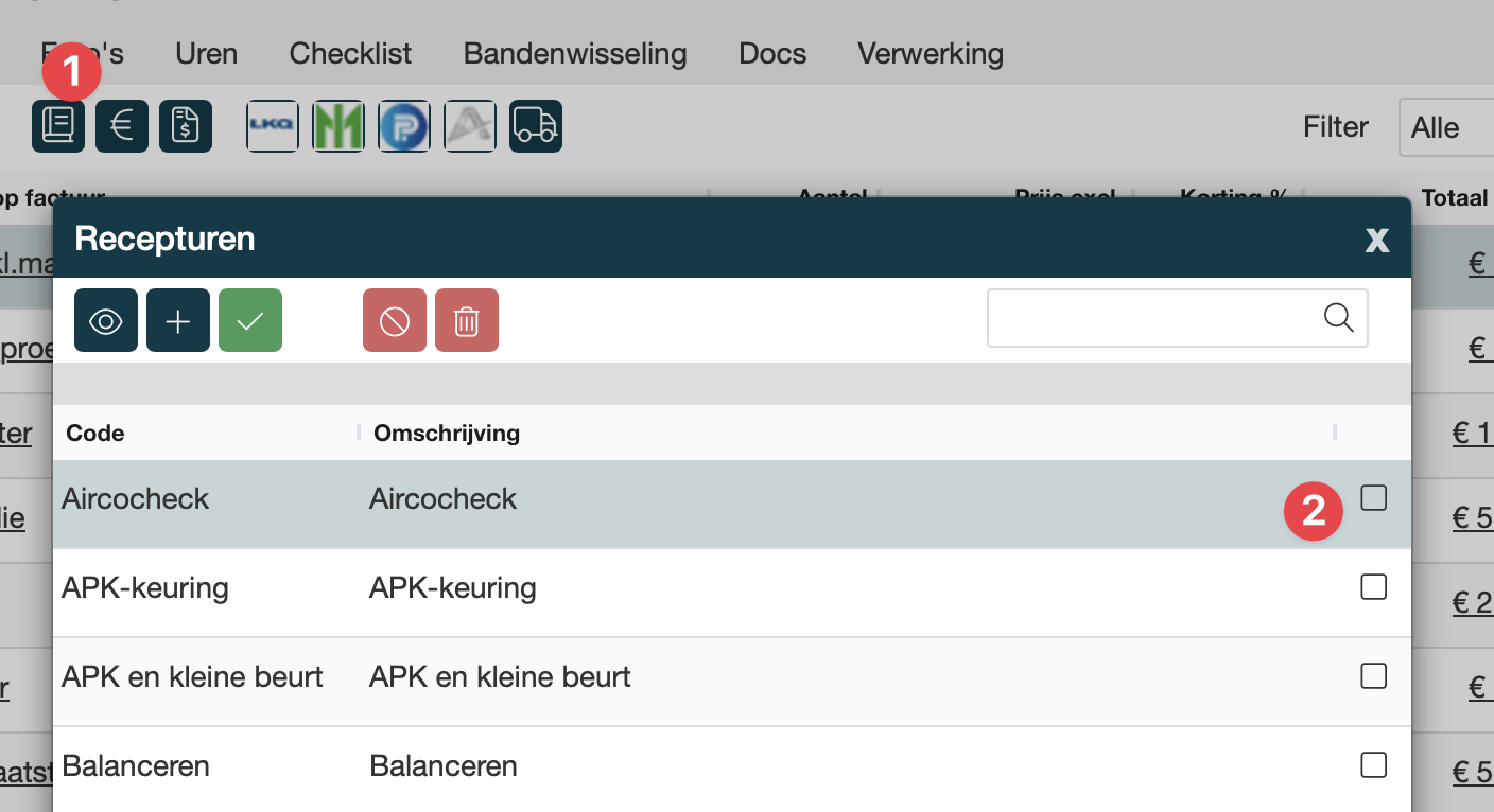 Je krijgt het volgende scherm, je kan ook meerdere recepturen selecteren, klik op het vinkje achter de regel. | |